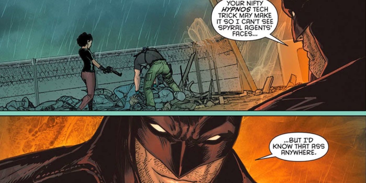 Una debilidad táctica revelada en 2015 #6, esta serie sigue a Dick después de que se convierte en un agente encubierto que investiga una organización astuta llamada Spyral. Al usar una pieza de tecnología de espionaje llamada Hypnos, Dick, también conocido como Agente 37, puede hacer que su rostro parezca un remolino, sin embargo, cuando Midnighter se encuentra con Midnighter durante una misión, este disfraz generalmente sólido se vuelve discutible. Teletransportándose detrás de Dick, Midnighter comenta que Dick’s Hypnos, “… puede que no pueda ver las caras de los agentes de Spyral… pero reconocería ese trasero en cualquier lugar”. demostrando descaradamente que Nightwing necesita tomarse en serio esta debilidad reveladora de identidad.