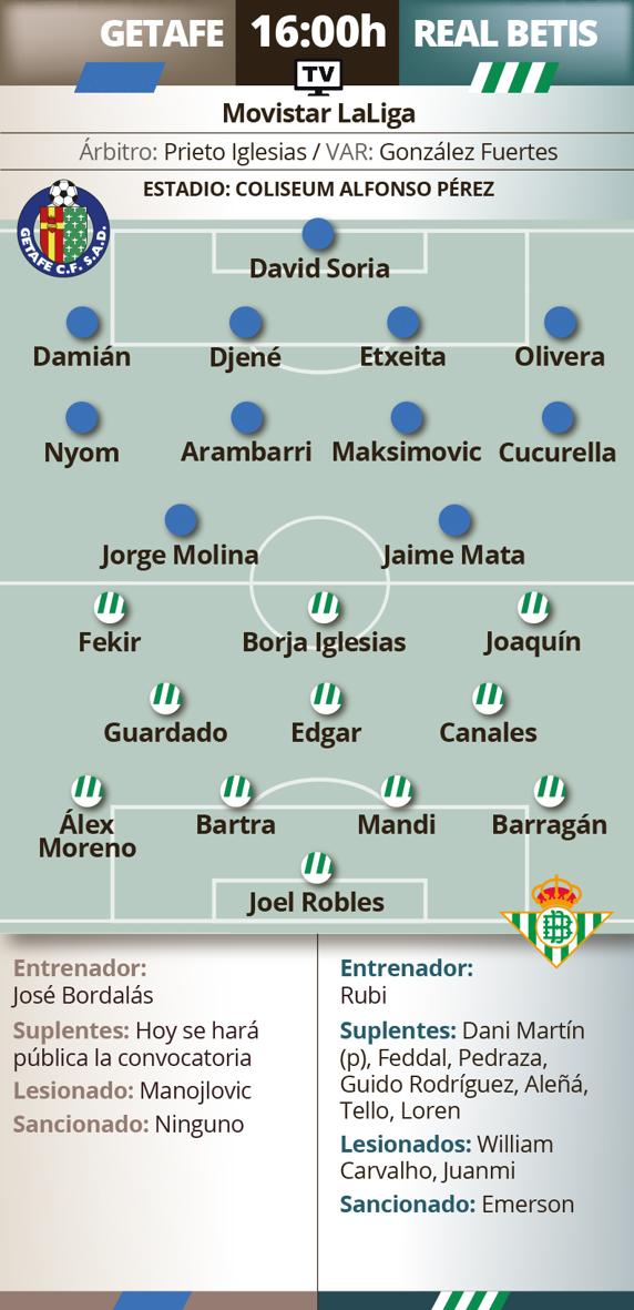 En las filas azulonas, Pepe Bordalás ha lamentado este sábado la marcha de Cabrera -uno de los fijos en el eje de la zaga junto a Djené-, que se ha marchado al Espanyol tras abonar los 9 millones de euros de su cláusula. “Era como un hijo para nosotros”, ha dicho el técnico madrileño, que sin embargo cuenta con el recién fichado Deyverson para el ataque y tendrá a sus jugadores mucho más frescos que los béticos, que el jueves disputaron una tensa y larga eliminatoria copera, con prórroga y penaltis. Bordalás también tiene la baja de Filip Manojlovic por lesión y mantiene las dudas hasta última hora del canario Ángel Rodríguez y del brasileño Kenedy.