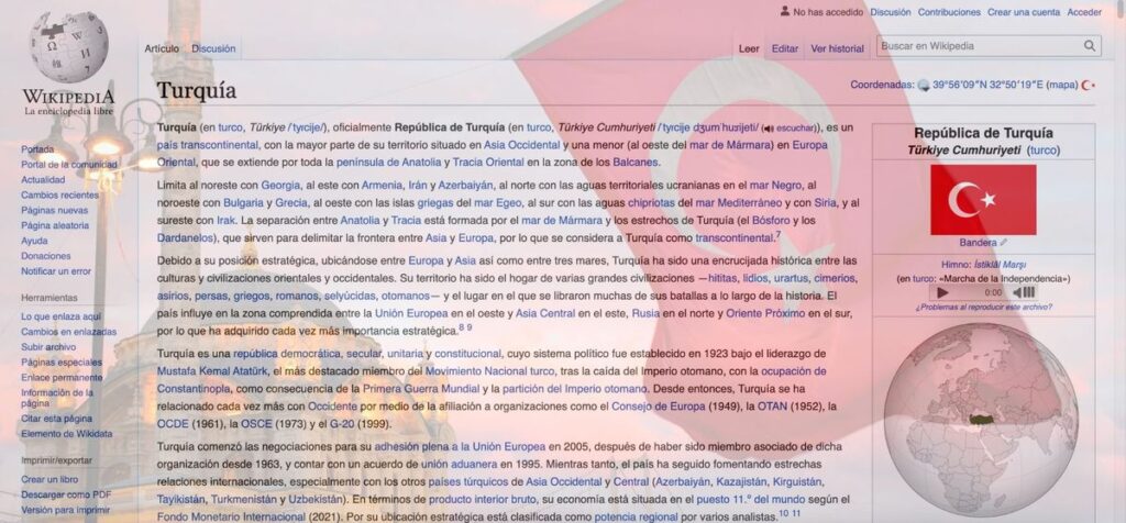 En abril de 2017, el Gobierno turco solicitó a Wikipedia que retirara dos artículos de su sitio web, alegando motivos de seguridad. Uno se titulaba “Terrorismo patrocinado por el Estado”; el otro, “Participación extranjera en la guerra civil siria”. Le dieron un plazo de cuatro horas para bloquearlas, pero, al cabo de ese periodo, la presidencia de Telecomunicaciones e Informática de Turquía consideró que no se podían bloquear solo esas dos páginas y procedió al bloqueo total del sitio web de Wikipedia en todos los idiomas.