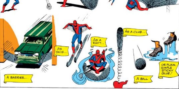 En Asombroso Hombre Araña Anual # 1 por Stan Lee y Steve Ditko, hay una breve explicación sobre las diferentes formas en que Peter puede usar su maravillosa red. Si bien se muestran los usos más estándar, como usarlo para balancearse por la ciudad (aunque este uso ha demostrado ser poco confiable para Spider-Man en el pasado), también se muestran una variedad de usos más interesantes. Algunos de estos usos son generalmente útiles en una variedad de situaciones, como crear un escudo o un paracaídas con una telaraña para protegerse, pero algunos son mucho más específicos. El más interesante de estos es la elaboración de esquís a partir de correas, aparentemente para cuando Spider-Man necesite bajar rápidamente de una montaña nevada.