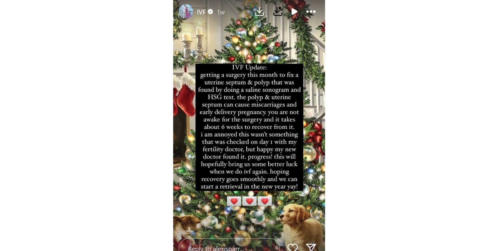 alexis y Hunter han estado tratando desesperadamente de ser padres juntos, pero han encontrado obstáculos con la fertilidad de Alexis lo que les ha llevado a buscar la ayuda de la FIV. Alexis ha estado documentando su viaje de FIV y el de Hunter a través de un carrete destacado de Instagram titulado “FIV”.