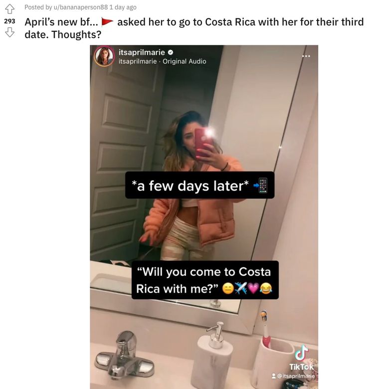 usuario de Reddit bananaperson88 compartió una captura de pantalla de el ultimátum La estrella de la temporada 1, April, les dice a sus seguidores que Cody la invitó a Costa Rica unos días después de conocerla. “El nuevo novio de April… le pidió que fuera a Costa Rica con ella para su tercera cita. ¿Pensamientos?“, preguntó el usuario, y agregó un emoji de “bandera roja”. Muchos comentaristas estaban divididos, ya que algunos temían que Cody se estaba moviendo demasiado rápido y podría estar bombardeando a April”.¿No es eso (ubicaciones de citas extremas) lo que el estafador de Tinder les hizo a sus víctimas?”, escribió un comentarista preocupado. Otros usuarios comentaron que Cody parecía haberse precipitado en su relación con April. “Tal vez sea la mamá que hay en mí, pero esto me está dando una gran ansiedad por ella. Apenas conoce a este hombre. escribió otro fan alarmado. “Bombardeo de amor”, escribió un comentarista, mientras que otro respondió: “Sí, esto es muy común en los narcisistas que se van de viaje muy temprano… de hecho, es una señal de alerta.