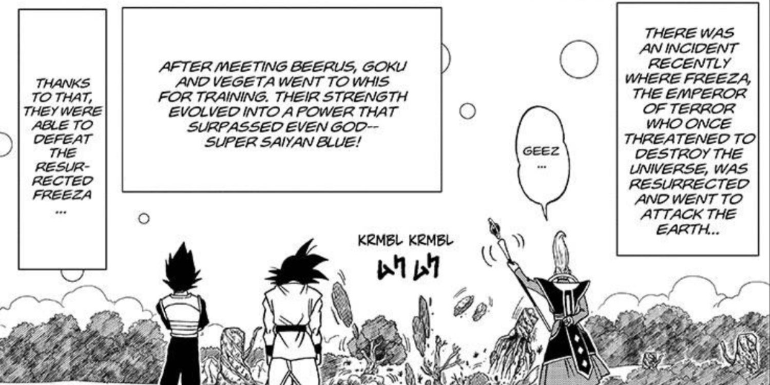 En realidad, el manga en sí no comenzó con ningún material original. La serie comenzó adaptando inmediatamente eventos de la película. Dragon Ball Z La batalla de los Dioses, que debutó unos años antes. El manga logró condensar la historia general en un bonito y ordenado paquete de sólo cuatro capítulos de 19 páginas. Aún más impresionante, la totalidad de Dragon Ball Z: Resurrección ‘F’ se resumió en una sola celda en el capítulo #5 de Dragon Ball Súper del escritor Akira Toriyama y el artista Toyotarou.