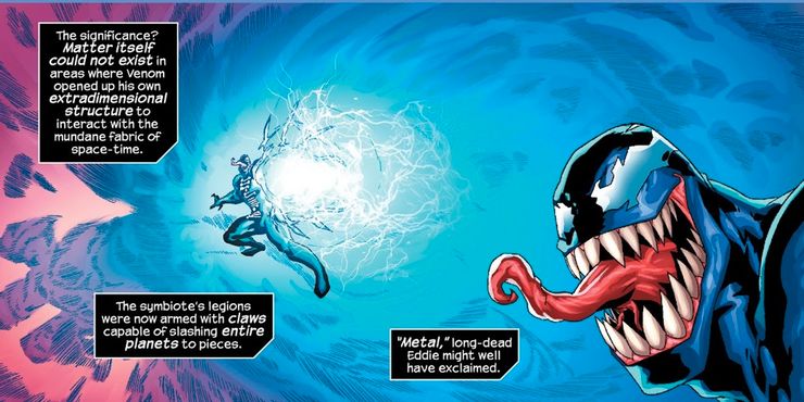 Obligado a luchar solo contra las máquinas, Venom buscó dentro de su códice de anfitriones anteriores y encontró al X-Man Jamie Madrox, que tenía la capacidad de multiplicarse. A través de este poder, Venom creó un ejército de sí mismo para luchar. Pero eso todavía no era suficiente. Para desatar el arma definitiva, Venom encontró una manera de extenderse a través del espacio-tiempo, lo que resultó en la desintegración de toda la materia que ocupaba la matriz de Venom. Básicamente, Venom destruyó la existencia para acabar con las máquinas.