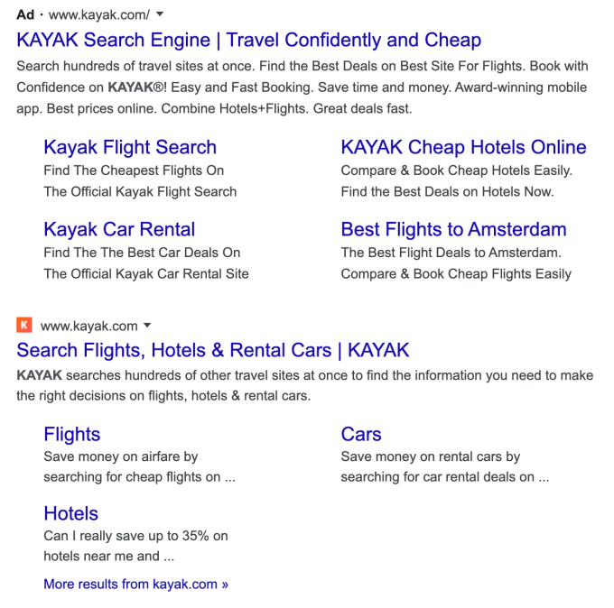 Aquí, por ejemplo, están los dos primeros resultados de una búsqueda en Google para el motor de búsqueda de vuelos “Kayak”, con solo una pequeña etiqueta de “Anuncio” para distinguir el clic que hará que Google gane dinero del clic que no …