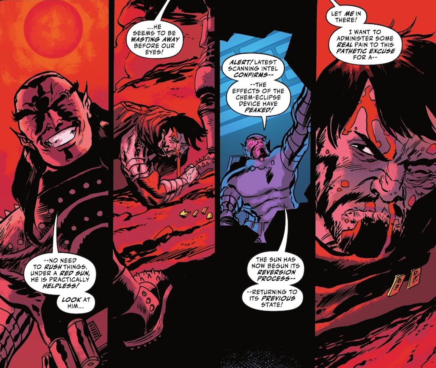 Si bien al principio el ejército de Khund parece irremediablemente superado, revelan una Arma secreta sorpresa que hace que incluso la kriptonita parezca ridícula: un “dispositivo de eclipse químico,” que afirman que puede afectar “la estructura molecular de cualquier estrella“. Con solo unos pocos cohetes, los Khunds convierten el sol amarillo de Zod en uno rojo, despojándolo rápidamente a él y a su esposa Ursa, cambiando el rumbo de la guerra instantáneamente (aunque sea temporalmente).