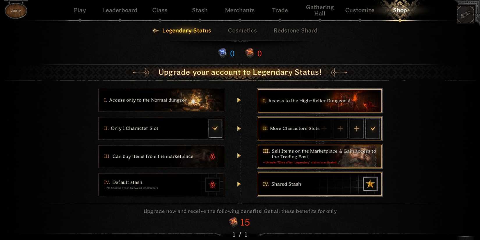 A pesar de Oscuro y más oscuro está disponible como título Free To PlayEn verdad, esta versión del juego se parece más a una demostración extendida. Tener una cuenta con “Estado de escudero” limita el juego a mazmorras de dificultad normal.lo que los excluye de los desafíos de mayor dificultad. De manera similar, solo hay un espacio de personaje disponible con una cuenta gratuita y también hay limitaciones sobre cómo se pueden administrar los elementos. La actualización al juego completo, conocido como estado legendario, se paga utilizando la moneda premium propia del juego., fragmentos de piedra roja; más específicamente, 15 fragmentos de Redstone, lo que equivale a 30 dólares.