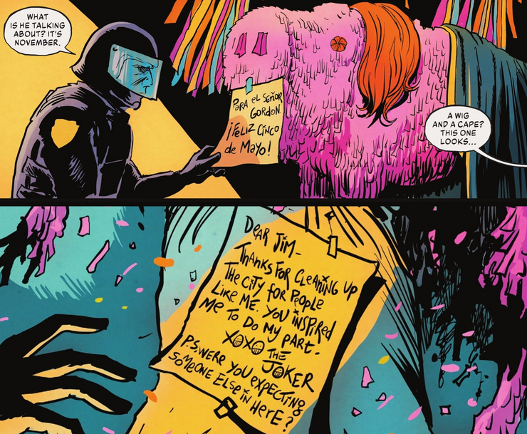 El problema termina cuando el GCPD descubre una habitación llena de piñatas, llena de víctimas de Joker. Uno en particular está dirigido a Gordon, y está vestido con una peluca roja y una capa negra, lo que indica que Batgirl, que ha estado luchando contra el crimen con Batman durante todo el número, está adentro. Afortunadamente, el cuerpo adentro no es Barbara Gordon, pero una nota burlona dice: “¿Esperabas a alguien más aquí?” Fue revelado en un número anterior de El Joker que Gordon ha sabido durante mucho tiempo que su hija Barbara es Batgirl, pero esta nota implica que es posible que Joker también lo supiera, lo que podría cambiar drásticamente el contexto para que Joker le disparara infame a Barbara en La broma asesina. En ese momento se creía que Joker le disparó a Barbara para traumatizar a Gordon, pero si Joker sabía que Barbara era Batgirl, entonces quizás sus razones para el ataque no eran solo por el comisionado.