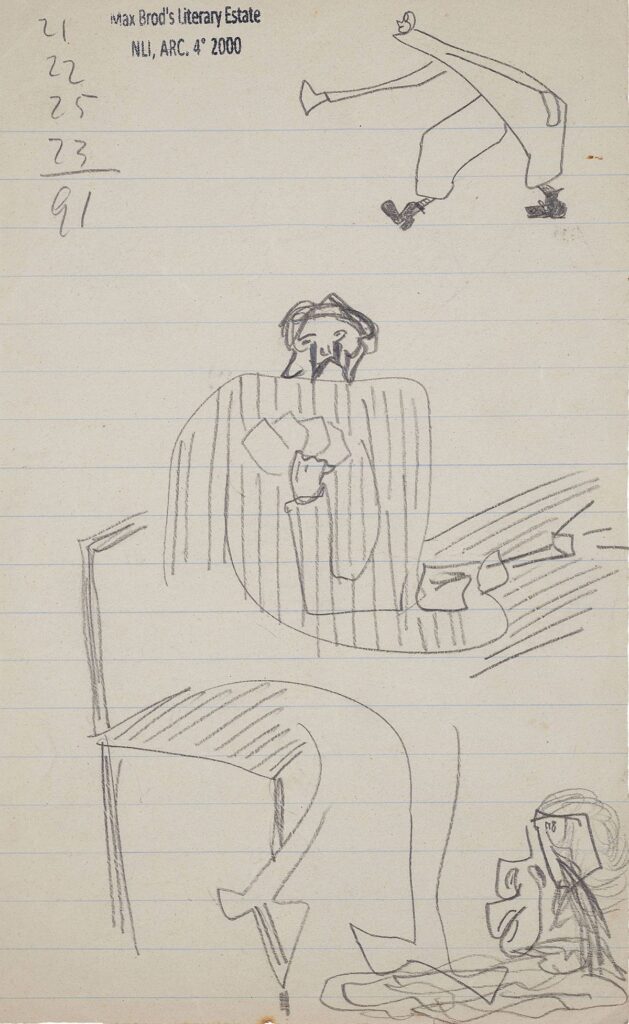 La supervivencia de los dibujos también merece la adjetivación del apellido del autor. Kafka especificó en su famoso testamento de 1921 en el que pide a su albacea y amigo Max Brod que destruyera tanto sus textos… como sus dibujos. Tampoco le hizo caso en eso. Es más, Brod se había dedicado a recoger de las papeleras los que Kafka tiraba, mientras le pedía que le regalara los folios emborronados con sus dibujos. E incluso se puso a recortar de los libros de leyes del autor de El castillo los márgenes que el escritor sembraba con sus dibujos, “en una especie de contraposición carnavalesca a los contenidos jurídicos”, apunta Kilcher.