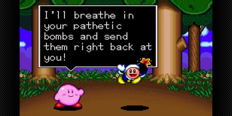 Lo que es aún más notable acerca de La avalancha de Kirby es que Kirby es un completo idiota con sus enemigos. Se niega a ayudar a un asustado Waddle Dee en el bosque, llama a las bombas de Poppy Bros “patéticas”, pisa deliberadamente las raíces de Whispy Woods cuando se le pide que no lo haga, y responde con sarcasmo cuando Bugzzy se precipita hacia él, llama a Heavy Mole encubierto, e insulta las habilidades de puntería de Kracko. Es sorprendente no solo ver a Kirby hablar, sino también ver cómo arroja quemaduras enfermizas a sus enemigos, en lugar de que Kirby intente devorarlos por completo, como lo hace en el otro. Kirby juegos.
