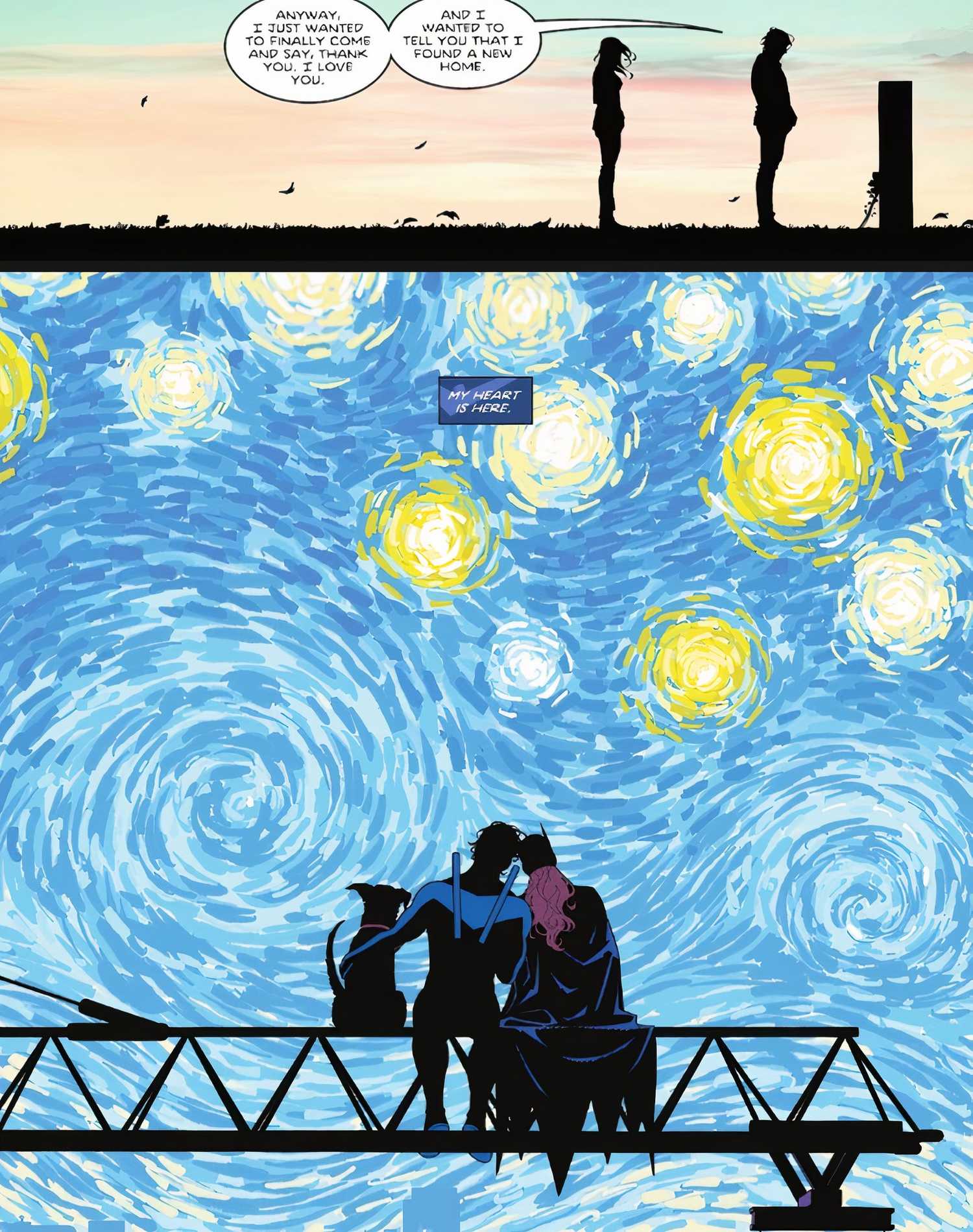 El panel final muestra a Nightwing, Batgirl y Haley encaramados en lo alto de una grúa, con vistas a la ciudad. Esta impresionante imagen se combina con la narración final de Dick: “Mi corazón está aquí”. Estas cuatro palabras confirman que Dick ha encontrado su verdadero hogar y resumen a la perfección la esencia de toda la serie. La carrera de Taylor y Redondo estuvo llena de “corazón” en cada tema, ya sea el amor de Dick por sus seres queridos perdidos (Alfred Pennyworth, Mary y John Grayson), su familia (Bruce, Damian, Barbara y Haley) o su ciudad. Ninguna palabra podría haber concluido mejor esta serie que estas cuatro.