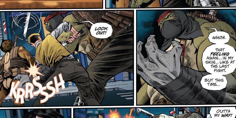 Después de que dos bandas rivales se declararan la guerra sin tener en cuenta a los inocentes que las rodeaban, el nuevo equipo de las Tortugas, formado por Uno, Moja, Odyn y Yi, junto con April O’Neil y su hija Casey Marie, se lanzan a la lucha para detener la locura. Utilizando sus refinadas técnicas de ninjitsu y su dominio de varias armas ninja para derrotar a la marea criminal, no pasa mucho tiempo antes de que Odyn empiece a sentir que su piel se tensa de nuevo. Con el puño cerrado, Odyn pronto se da cuenta: “¡Puedo controlarlo!” y con un golpe, noquea a su oponente con facilidad.