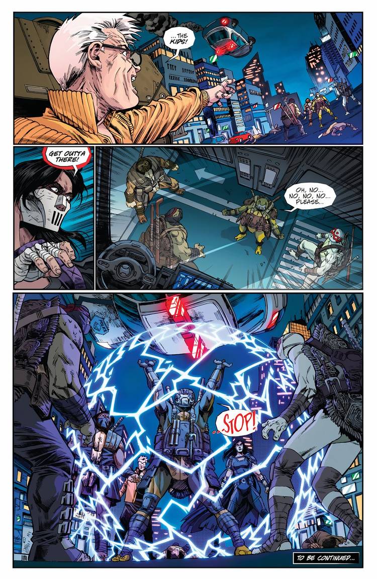 Enviados por una renuente April O’Neil y su hija Casey Marie para ayudar a sofocar una pelea entre dos de las peores pandillas de la ciudad, Uno, Moja, Odyn y Yi se lanzan a la refriega equipados con múltiples armas ninja, máscaras de batalla increíbles y un entusiasmo palpable por demostrar que son héroes. Atrapada bajo los restos de un coche de policía que se derrumba, Yi levanta las manos hacia el cielo como para evitar que la aplaste a ella y a sus hermanos, y en su desesperación, evoca un campo de fuerza eléctrico que detiene el coche.debutando oficialmente su poder en el panel.