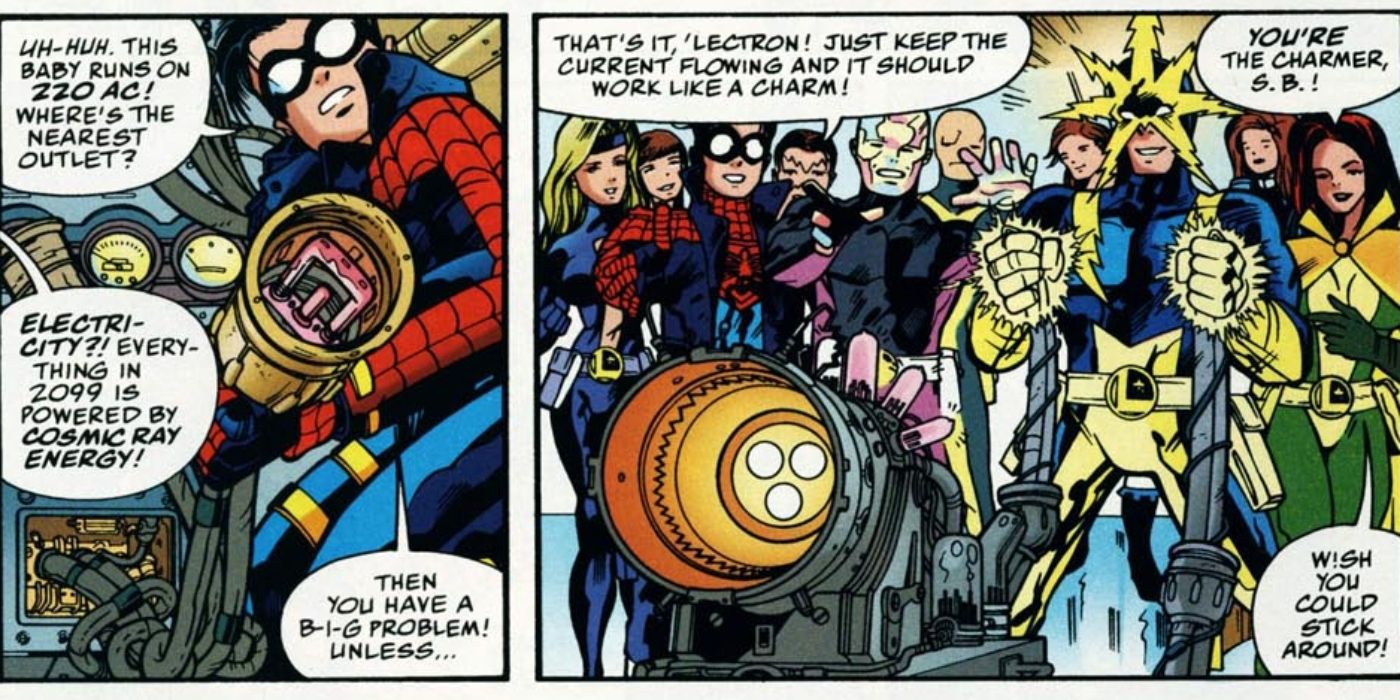 En el cómic del Universo Amalgam Equipo de Spider-Boy # 1 de Roger Stern, Karl Kesel y Jose Ladronn, la fusión de Spider-Man y Superboy (conocido como Spider-Boy) es llevada al futuro de 2099 por los héroes más grandes de ese período. Durante el transcurso de esta aventura, Spider-Boy se encuentra con villanos que manipulan el tiempo, se hace responsable del surgimiento del futuro héroe más grande de todos los tiempos (Spider-Boy 2099) y es testigo de cómo la línea de tiempo cambia drásticamente. En un momento, cuando se vuelve imperativo para Spider-Boy retroceder en el tiempo a su presente original, descubre que el futuro en el que estaba atrapado había cambiado tanto que la máquina del tiempo original ni siquiera funcionaba. Spider-Boy dice que necesita electricidad para hacer funcionar la máquina, pero se le explica que la versión ahora permanente del mundo en 2099 no usa electricidad, solo energía de rayos cósmicos.