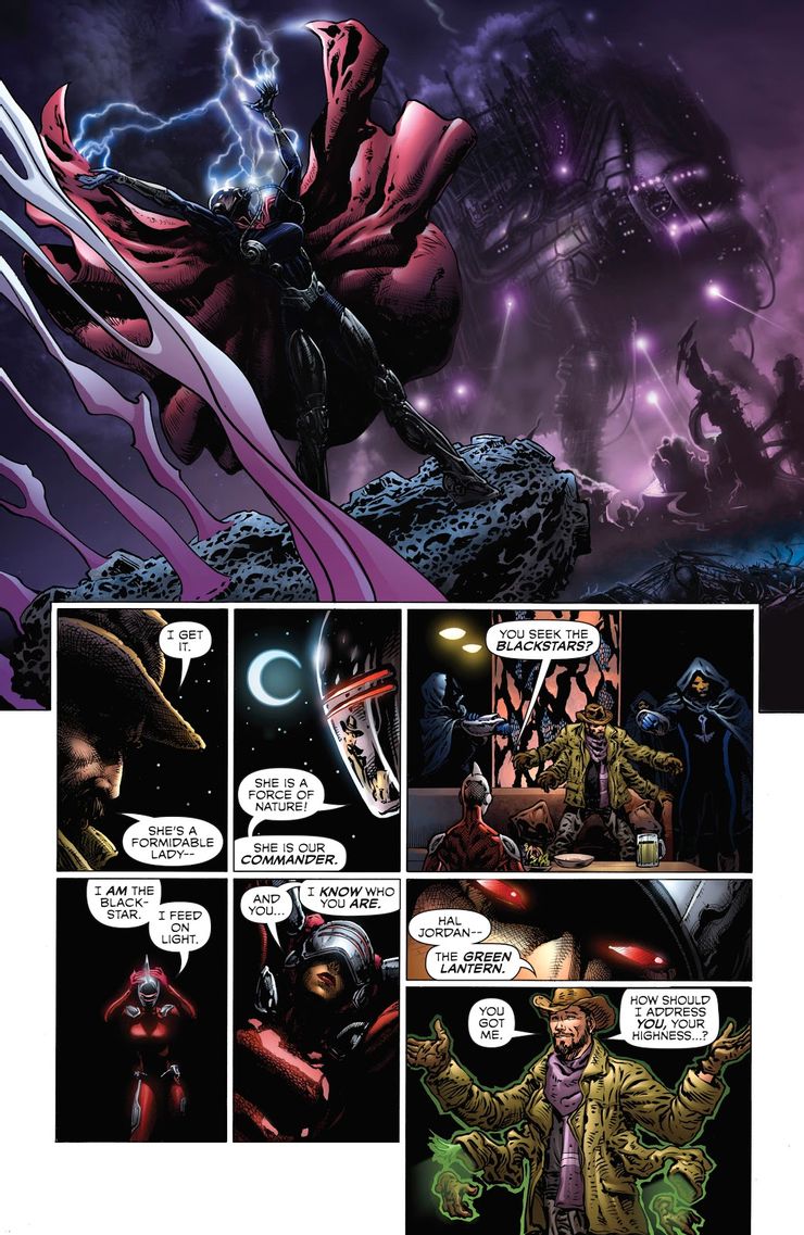 En La Linterna Verde #4 por Grant Morrison y Liam Sharp, Hal Jordan está encubierto en un intento de acercarse a los Blackstars, un grupo de vampiros cósmicos decididos a darse un festín con las estrellas, y que actualmente tienen un informante dentro del Green Lantern Corps. Hal ha organizado una reunión con uno de sus representantes y se disfraza para enmascarar su identidad; Si bien la estratagema inicialmente funciona, Hal finalmente abandona el juego y los Blackstars lo escoltan a uno de sus mundos para ser iniciado en la fuerza. Podría decirse que el disfraz de Green Lantern en este número no es nada loco. Una gabardina larga, un sombrero y una barba postiza serían suficientes para engañar a la mayoría de los terrícolas; Sin embargo, el día a día de Hal Jordan no involucra a la mayoría de los terrícolas, y usando su anillo de poder, Jordan se da a sí mismo un par de brazos extra para pretender ser un extraterrestre no humano. Dado que el anillo y sus construcciones funcionan con la mente de Green Lantern, las extremidades se articulan con la gracia natural necesaria para lograr la ilusión de ser una especie completamente diferente. Si bien, lamentablemente, el disfraz es de corta duración, el ingenio de Jordan está a la vista mientras arma un disfraz convincente.