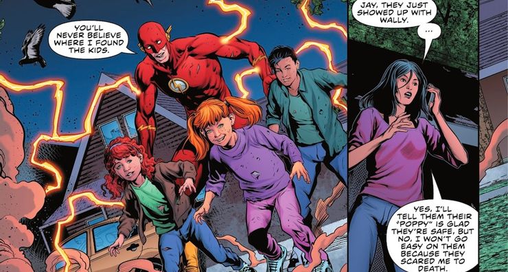 El comienzo de El relámpago #780 escrito por Jeremy Adams y dibujado por Will Conrad, continúa donde terminó esa aventura. Flash y los niños regresan a la casa de Wally West y se reúnen con su esposa. Todos se dan un abrazo en el patio delantero, aliviados de estar a salvo, pero Wally nunca se da cuenta de lo irresponsable que es esto. Alguien podría ver esta reunión y darse cuenta de que Wally West es, de hecho, Flash y esos son sus hijos. Esto es especialmente preocupante cuando todo lo que realmente tiene que hacer es cambiarse de ropa a gran velocidad. Luego volvería a su personalidad civil y nadie se daría cuenta de la identidad secreta de Flash.
