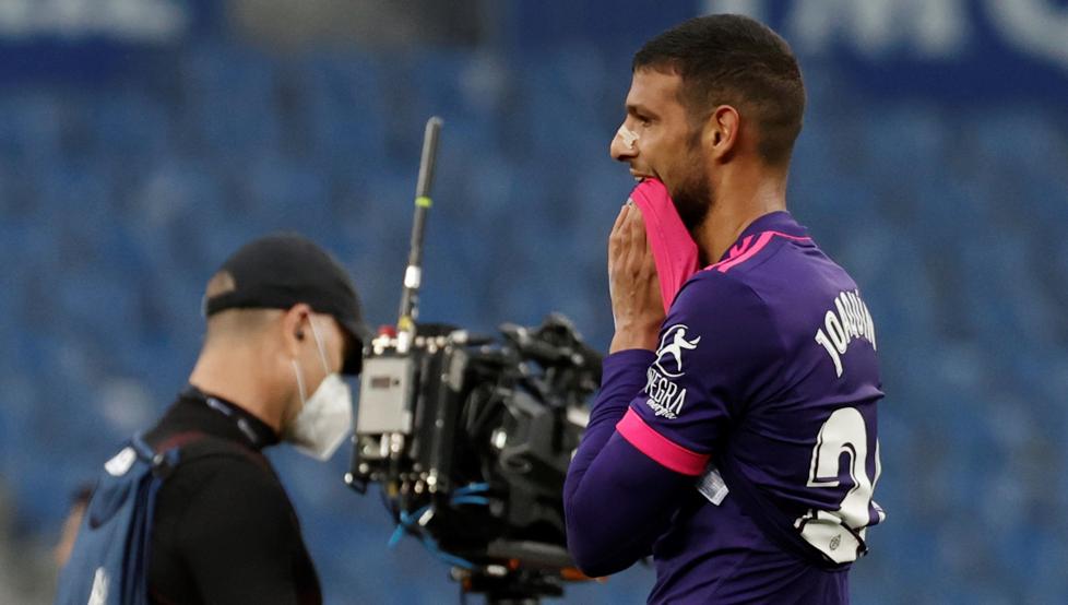 Joaquín Fernández, jugador del Real Valladolid, ha dado la cara este lunes en rueda de prensa telemática tras la dolorosa derrota sufrida en Anoeta y que deja al cuadro albivioleta a un paso de Segunda división… antes de recibir al Atlético de Madrid, que se juega el título, en la última jornada.