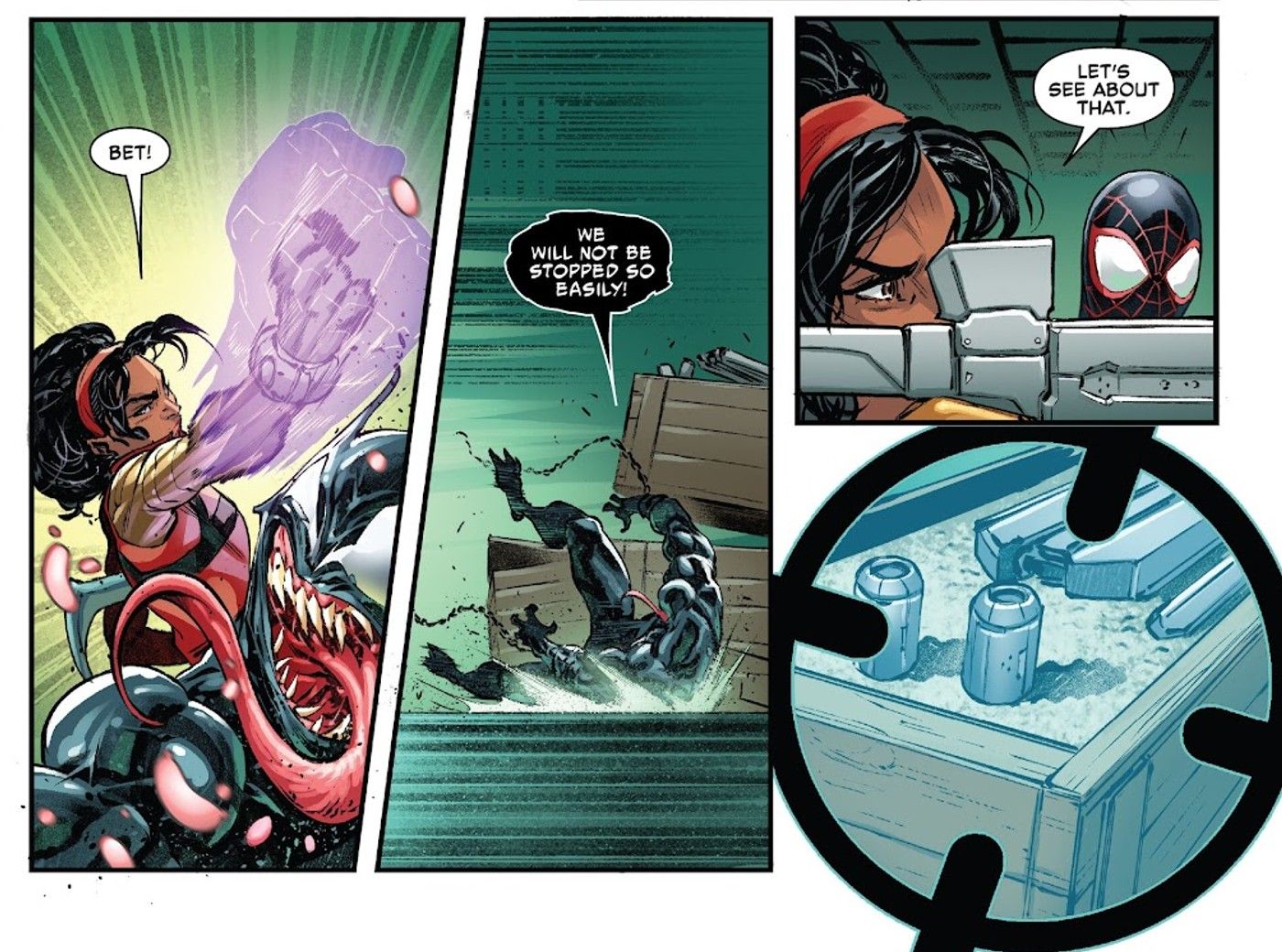 Durante su pelea con Venom, Spider-Man lucha por hacer el trabajo. Dice que quiere calmar a Venom más que pelear con él. Por lo tanto, se puede inferir que está dando golpes, a pesar de que Venom evidentemente no se contiene. ¿Caballero brumoso? No tanto. Ella vuelve a entrar en escena balanceándose (literalmente) con un puñetazo y una pistola, terminando esta debacle con un disparo de fuego que, considerando una de las mayores debilidades de Venom, teóricamente podría matar al simbionte.