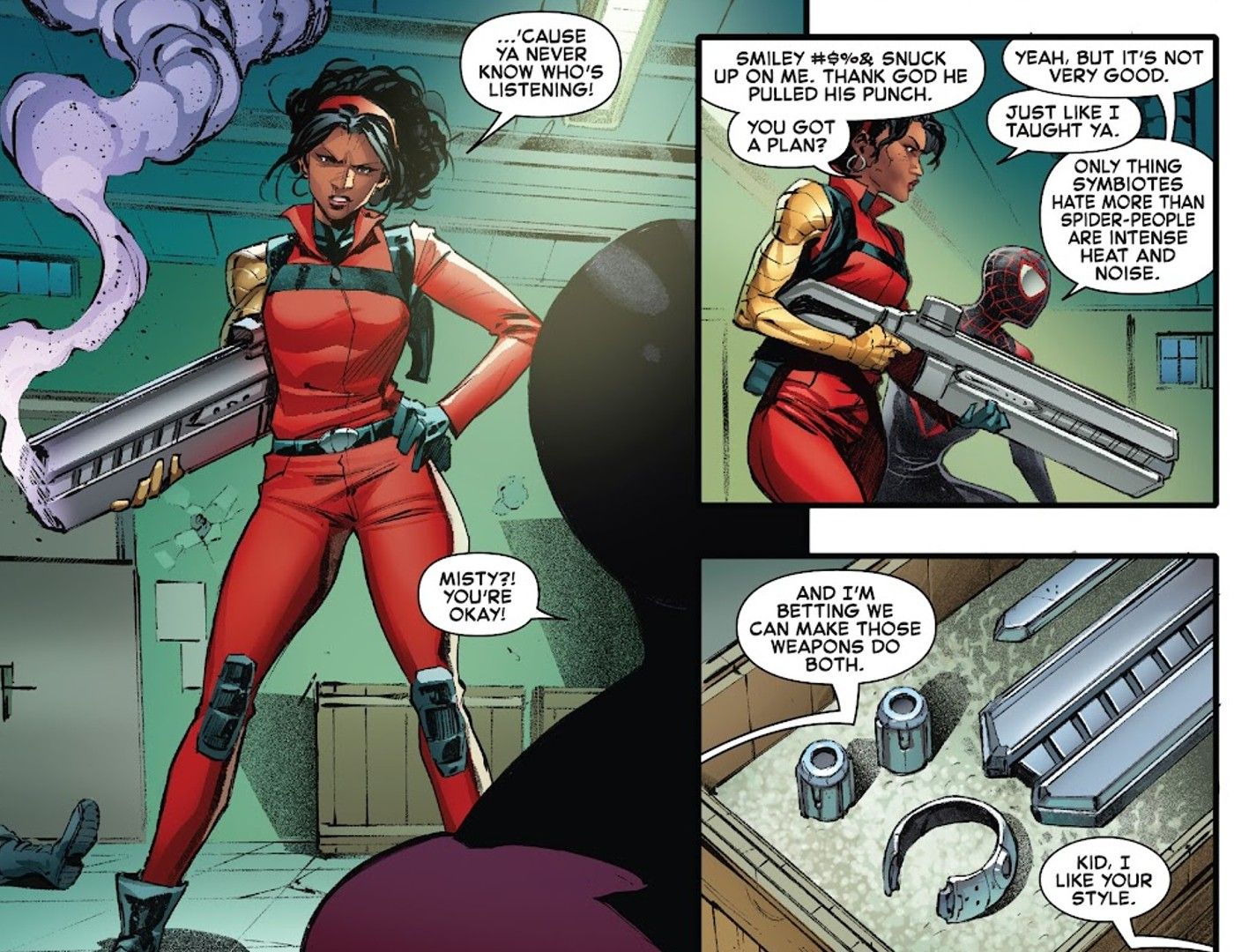 Sin embargo, el vencedor de la última versión de Spidey y Venom no es ningún hombre, sino una de las Hijas del Dragón, Misty Knight. Miles y Dylan se pelean por primera vez Spider-Man de tamaño gigante #1 de Cody Ziglar, Iban Coello, Guru-eFX y Joe Caramagna de VC. Con la autoridad del alcalde Luke Cage, Miles Morales y Misty Knight (uno de los nuevos mentores de Miles que lo entrenó) investigan la operación tecnológica ilegal de Black Obsidian.