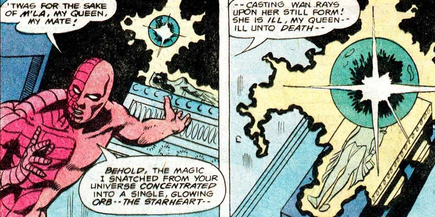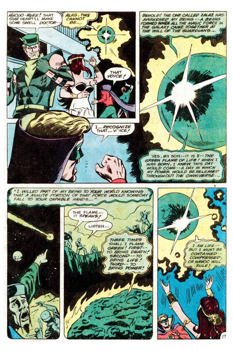 Eso cambió en 1978. Linterna Verde #111. Un cruce entre Alan Scott y Hal Jordan, la historia reveló la existencia de Starheart. Su historia es muy similar a la que Emerald Flame le cuenta a Alan Scott: los Guardianes libraron una guerra contra la magia y, posteriormente, la reunieron toda en una sola fuente, que se convirtió en Starheart. Luego, los Guardianes lo aprisionaron dentro de una estrella y, con el tiempo, se volvió consciente de sí mismo y anhelaba escapar. Finalmente, una pequeña porción se liberó y viajó a través del cosmos, aterrizando finalmente en la China medieval, donde finalmente encontró a Alan Scott.
