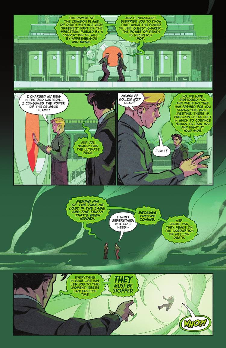 Alan Scott: El Linterna Verde El número 5 está escrito por Tim Sheridan y dibujado por Cian Tormey. Alan Scott ha sido salvado por Emerald Flame, una personificación de su fuente de poder. Le explica el origen de las Llamas Esmeralda y Carmesí. Los Guardianes del Universo reunieron magia salvaje en un orbe verde gigante y lo aprisionaron dentro de una estrella, donde se volvió sensible. Una porción de su esencia escapó, convirtiéndose en la fuente de energía de Green Lantern. Otro bit vio la fuga, se puso envidioso y finalmente sucumbió a la ira.