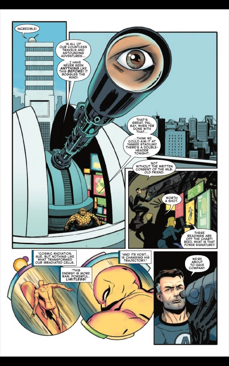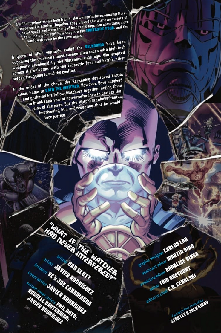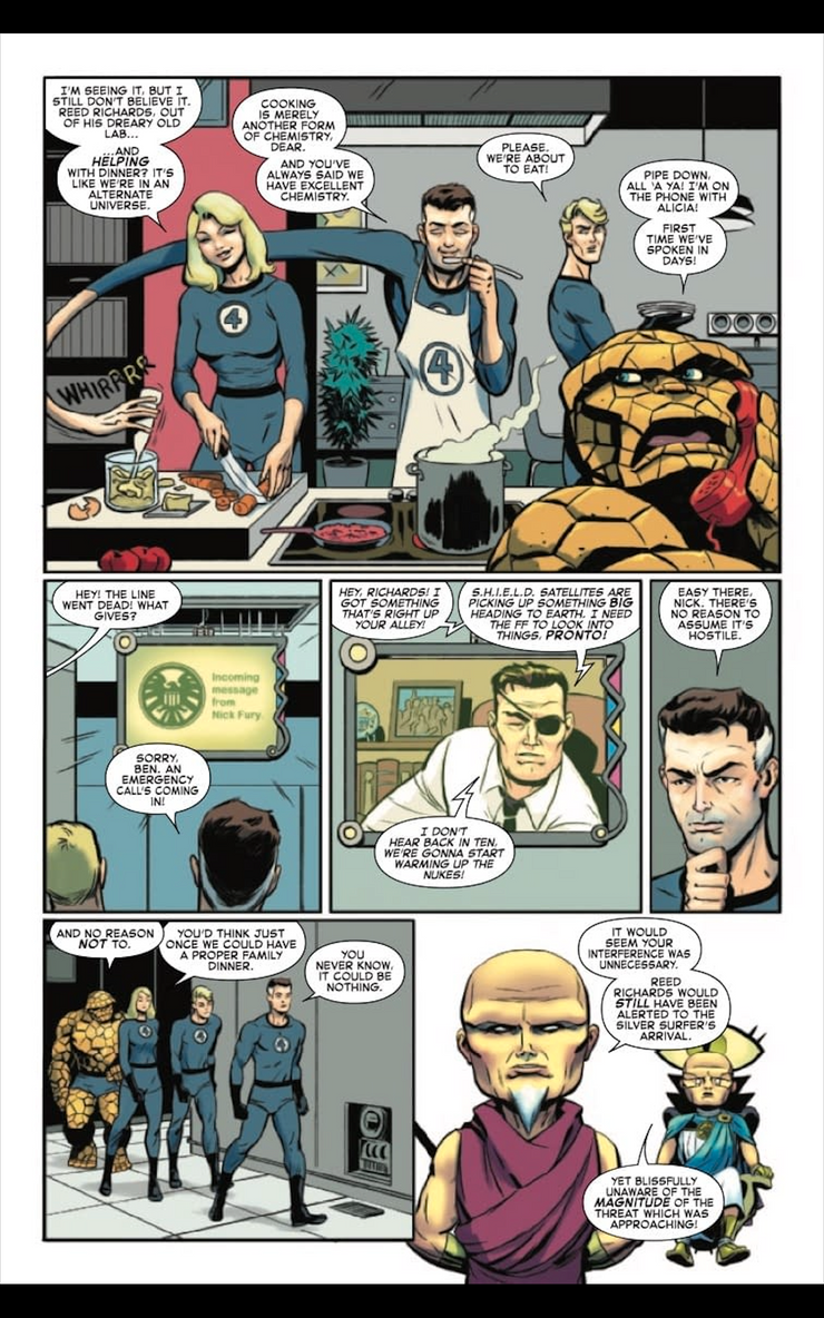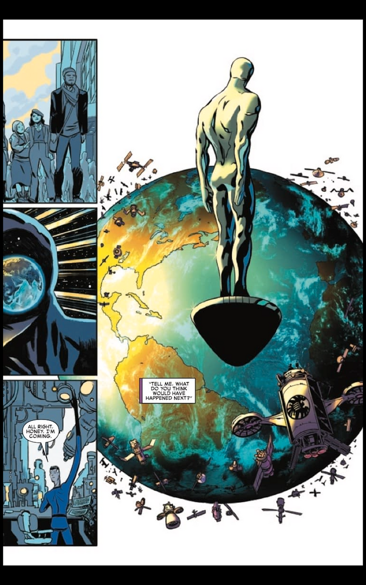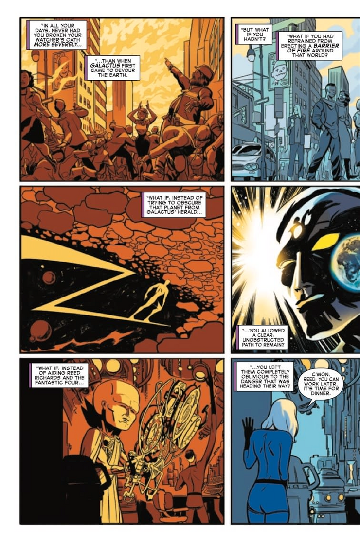 Las páginas de vista previa de la serie derivada revelan que el compañero Vigilante de Uatu lo regaña por romper su juramento repetidamente, como debería ser, pero la primera vez que descuidó su juramento también fue la más importante. “En todos tus días, nunca habías roto tu juramento de Vigilante más severamente que cuando Galactus vino por primera vez a devorar la Tierra”. De hecho, la Trilogía de Galactus comenzó con los Cuatro Fantásticos notando el cielo en llamas, pero esto es obra del Vigilante; sus intentos de ocultar la Tierra de Galactus son en última instancia inútiles. El Vigilante está claramente interfiriendo desde la página 1… incluso cuando reafirma su juramento mientras que se discute ¡su no interferencia con Galactus!