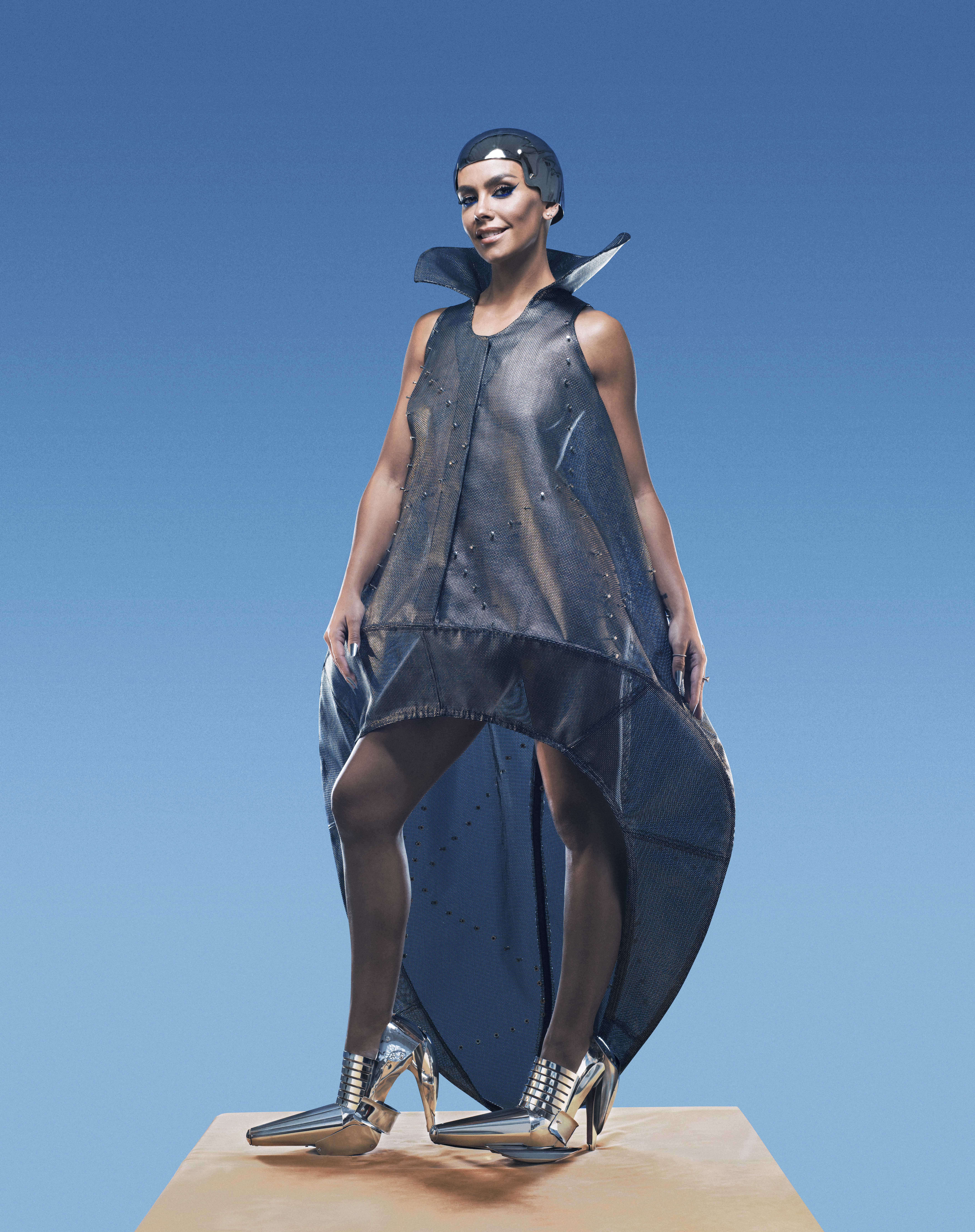 El diseño de Piña ha estado complementado por los de otros dos creadores españoles. Primero, y de forma bien visible, la capa alada de la presentadora, creada por Buj Studio, firma comandada por Raquel Buj, que lleva más de un lustro trabajando en el sector tras dar el salto desde la arquitectura y que con otras tres mujeres —Daniela Camacho, Andrea Rehbein y Paloma Martínez— ha pasado cuatro meses elaborando la pieza. “Requiere mucho trabajo manual, hay distintas técnicas: impresión 3D, que ha llevado entre 250 y 300 horas; corte láser, que tiene más de 30 horas; técnicas de unión y transformación de volúmenes con calor, más de 100 horas…”, enumera Buj, que cree que esta ocasión puede ayudarle y darle nombre en el mercado. “Es mi primera acción con tanta visibilidad y no sé muy bien ni lo que va a venir. Me hace ilusión, me gustó mucho”, asegura, destacando la gran profesionalidad de Pedroche y de Josie. “Son personas muy inteligentes, me pareció muy interesante el hecho de dejarme llevar de su mano, de confiar”, asegura.