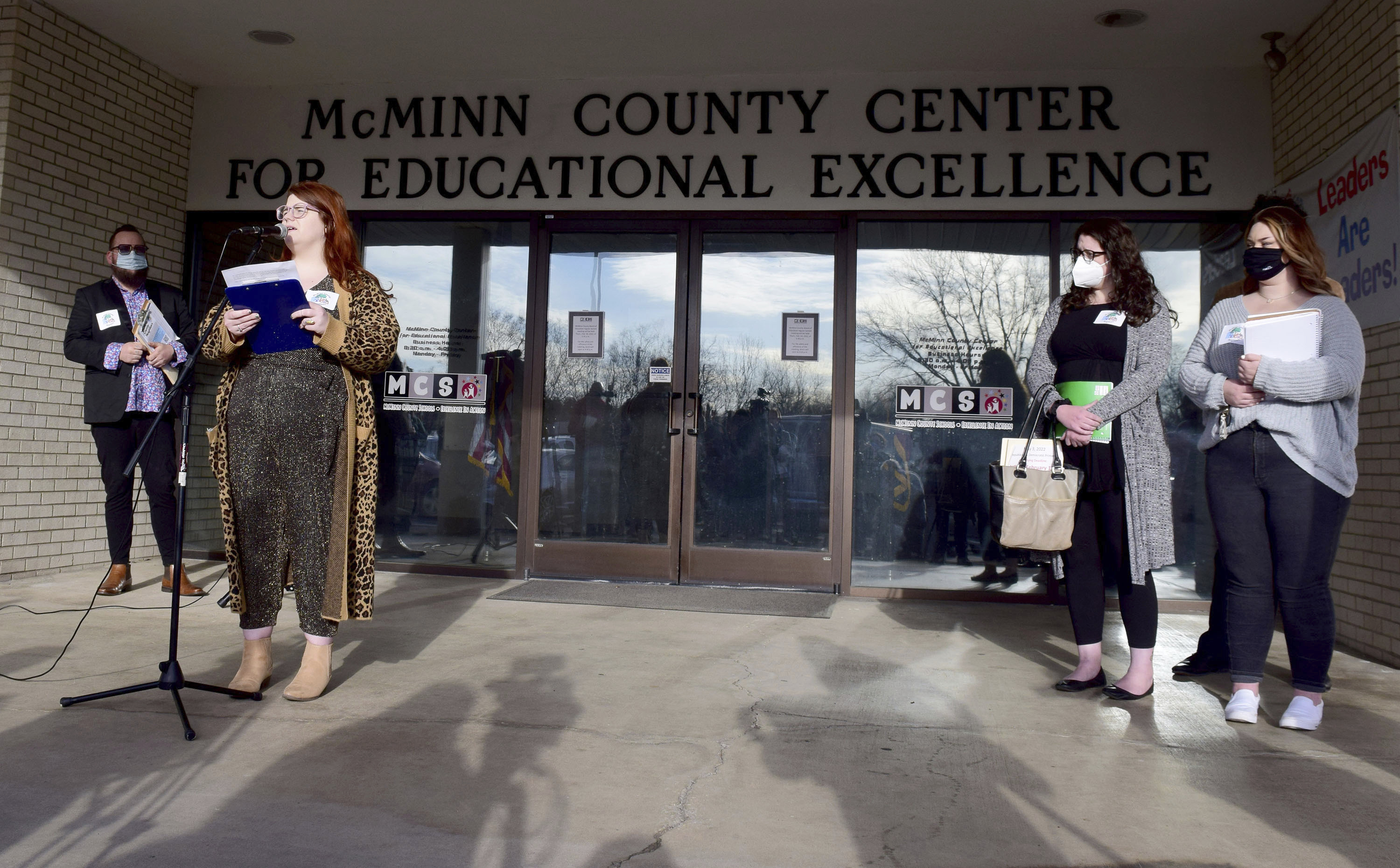 “Ese no es el objetivo de la educación”, reza el cartel que llevaba una mujer el 12 de febrero, en contra de la Junta Escolar del condado de McMinn (Tennessee). Robin Rudd/Chattanooga Times Free Press via AP (AP)
