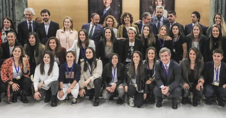 Representantes de la patronal, sindicatos, jugadoras y partidos políticos, este miércoles en el Congreso. En vídeo, las jugadoras españolas presentan el primer convenio de fútbol femenino. KIKE PARA | ATLAS