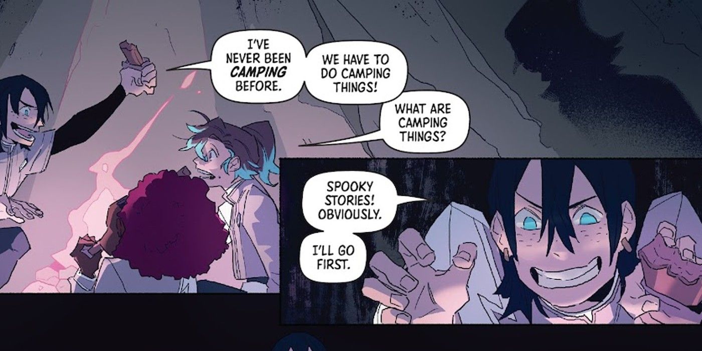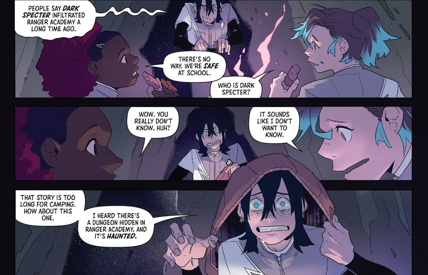 Lindy duda que tal ataque sea posible, bajo la impresión de que la escuela es lo más segura posible. Mientras tanto, el recién llegado Sage reflexiona en voz alta quién es Dark Spectre para empezar. En lugar de explicar, Theo dice que la historia sobre él es “demasiado largo” para una historia de campamento. “Demasiado largo” podría ser una referencia sutil a la historia de 12 meses “Darkest Hour” actualmente en curso, donde Dark Spectre viaja en diferentes líneas de tiempo (el pasado, el presente, el futuro y las realidades alternativas) para construir su Ejército Oscuro.