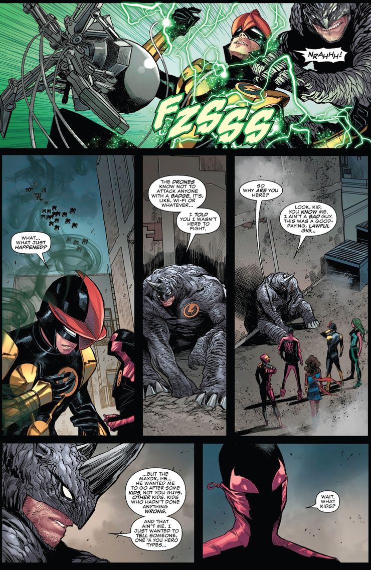 en Marvel Reino del diablo evento cruzado, Kingpin Wilson Fisk ha usado su poder como alcalde de Nueva York para prohibir efectivamente las actividades de superhéroes dentro de la ciudad. Los Thunderbolts, villanos a los que emplea Kingpin y con la ayuda de drones, tienen la tarea de arrestar a todos los superhéroes que no obedecen la ley. Pero durante una pelea entre los campeones (el equipo de superhéroes de la Sra. Marvel) y los drones, Rhino les da a los héroes todas las insignias de Thunderbolts, que obligan a los drones a ver a los campeones y aliados e interrumpir su ataque.