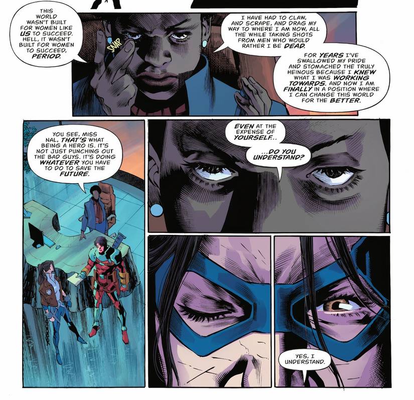 Waller sostiene que ser un héroe consiste en implementar un cambio real. Simplemente golpear a los malos no es suficiente para salvar al mundo a largo plazo. Es aquí donde Waller admite que está dispuesta a hacer cualquier cosa para salvar el mundo, que un verdadero héroe no lo que se necesita para salvar el futuro, incluso a costa de uno mismo. Esta última línea parece implicar que Waller está totalmente dispuesta a arriesgar su propia vida para salvar el mundo si es necesario.