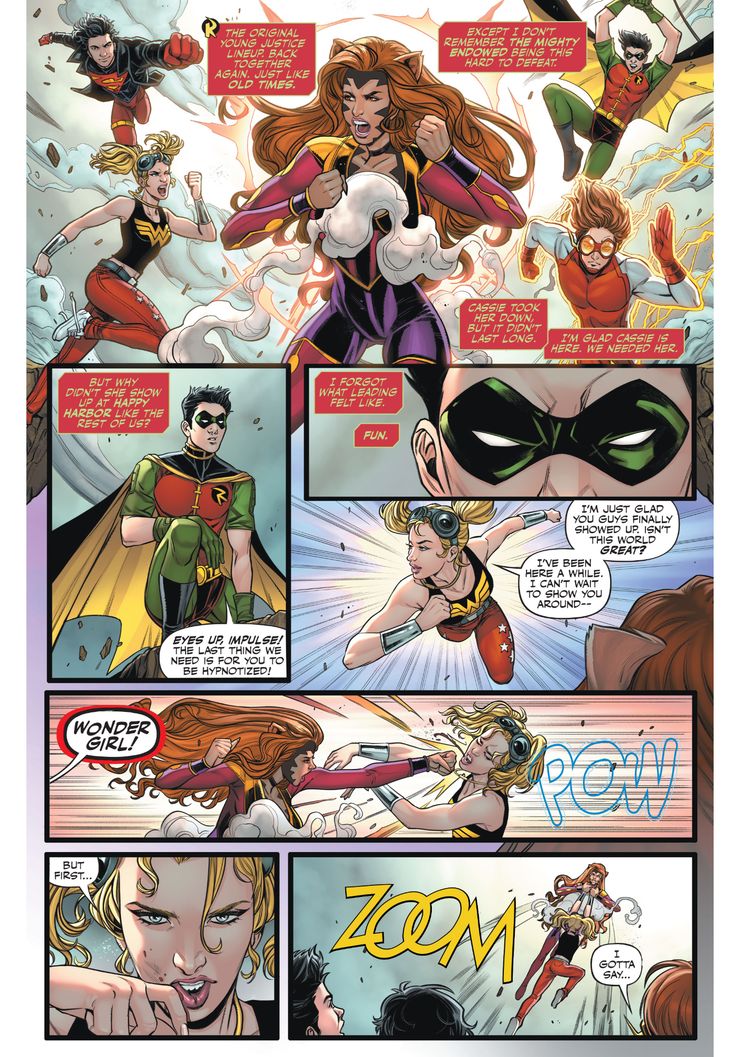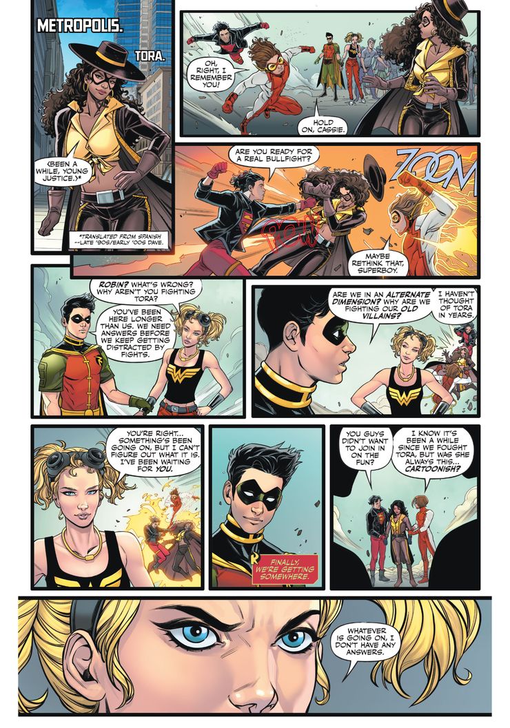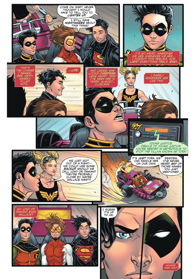 Cuando Oracle hace un llamado a Young Justice para ayudar con un villano llamado Tora, Tim Drake sugiere que tal vez deberían llamar a Jon Kent, Damian Wayne o Wallace West para pedir ayuda. Cassie responde extrañamente que no ha oído hablar de ninguno de los nombres que mencionó. Robin confronta a Wonder Girl sobre luchar contra el villano inapropiado y luchar contra Tora, quien le dice que no sabe lo que está pasando.