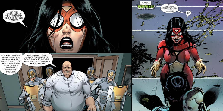 A pesar de las heridas recientes que Spider-Woman sufrió mientras luchaba contra su hermano, Jessica está lo suficientemente enfurecida con Fisk como para considerar golpearlo hasta convertirlo en pulpa. Sin embargo, su revelación de un gran villano que busca destruir su vida y la de sus seres queridos, naturalmente, la tiene conmocionada. Sorprendentemente, Kingpin revela en este nuevo número que ha liberado a Veranke, la ex reina Skrull que secuestró a Jessica y le robó su identidad (poderes y todo) hace años, haciéndose pasar por Spider-Woman durante mucho tiempo antes de que el invasión secreta evento para desestabilizar a los Vengadores. Si bien Veranke fue derribada por Norman Osborn al final del evento, este nuevo número revela que está viva y bien, cambiando de forma para parecerse a Jessica una vez más para atacar a sus amigos y secuestrar a su hijo Gerry.