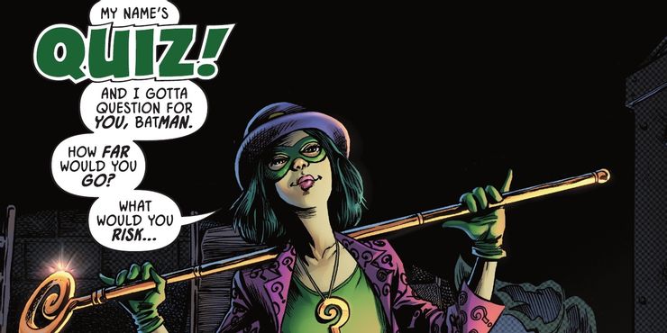 En el número 4, escrito e ilustrado por Darick Robertson, con tintas de Richard P. Clark, colores de Diego Rodríguez y letras de Simon Bowland, Batman instantáneamente siente que algo anda mal con la pista: es demasiado descuidada para Riddler, señalando parece crudo y apresurado. Batman rastrea la pista hasta un casino abandonado, pero es noqueado por un asaltante desconocido. Cuando vuelve en sí, está de pie frente a una mujer joven que lleva un traje morado y verde adornado con signos de interrogación, que se hace llamar Quiz. En el siguiente número, los lectores conocen la historia de fondo de Quiz: ella es la novia de Riddler y se conocieron cuando ella le envió pistas que, cuando las resolvió, le dio los códigos que necesitaría para llevar a cabo un atraco. Fue una trampa tendida por Quiz solo para conocerlo, y los dos terminaron llevándose bien. Batman luego se entera de que Scarecrow iba a configurar el Riddler sobre el gas venenoso, pero Quiz lo descubrió y salvó la vida del Riddler. Ahora, necesitan la ayuda de Batman para quitarles el calor.