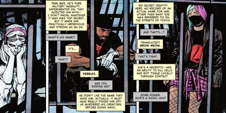 El personaje en cuestión es un recién llegado cuyo nombre real no se da, simplemente va por el apodo de villano que se le dio en su creación: Pebbles. Pebbles es el producto de una experimentación sobrehumana, inyectada con un suero no revelado que lo hace prácticamente impermeable con el beneficio adicional de la súper fuerza. Al igual que Marvel’s Wolverine cuando estaba sujeto al programa Weapon X, Pebbles escapó de sus captores y asesinó a sus creadores. La huida asesina de Pebbles fue indudablemente motivada por la experimentación inhumana que soportó, aunque el problema implica que Pebbles estaba mayormente molesto con el nombre que le dieron, lo que provocó su rabia homicida.