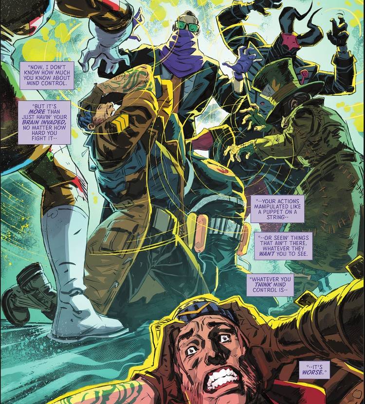John Layman and Jesús Hervás’s Escuadrón Suicida: Mata a Arkham Asylum El número 4 es testigo de cómo el Capitán Boomerang forma una alianza improbable con Mad Hatter, Hypnotic, Spellbinder y Crazy Quilt en medio del motín orquestado por Waller en Arkham Asylum. Este motín ve a todos los reclusos liberados pero contenidos dentro del Asilo, lo que resulta en un derramamiento de sangre entre ellos y los guardias.
