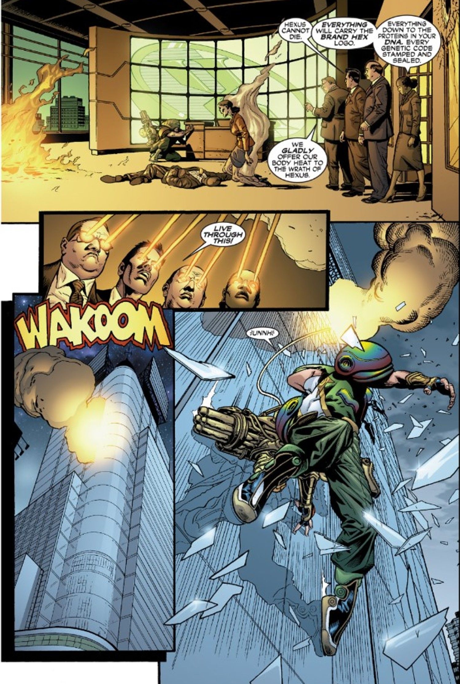 En chico maravilla #3, los empleados de Hexus afirman que, “Hexus no puede morir. Todo llevará el logo de Brand Hex. Todo hasta las proteínas en tu ADN.” En el momento del lanzamiento del libro, Hexus fue un comentario perspicaz sobre cómo la cultura del consumo y el surgimiento de las corporaciones estaba reescribiendo la experiencia humana. Mostrando cómo sus empleados eran desechables para Living Corporation, sus trabajadores mentalmente controlados podían combinar su calor corporal para disparar intensas ráfagas ópticas a Marvel Boy, en el proceso matando a los humanos individuales.En lugar de matar al parásito alienígena antagónico, Marvel Boy expuso sus secretos corporativos al mundo, arruinando sus planes para dominar el mundo.