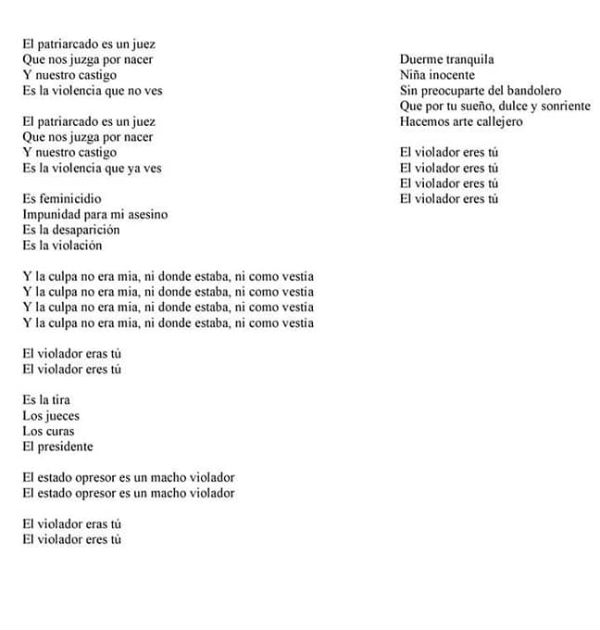 Dado que la letra de la canción fue creada originalmente en Chile, las mujeres que se manifestaron en México la modificaron para adapatarla, quedando como se puede ver en esta imagen compartida en Facebook por Aquelarre Violeta.