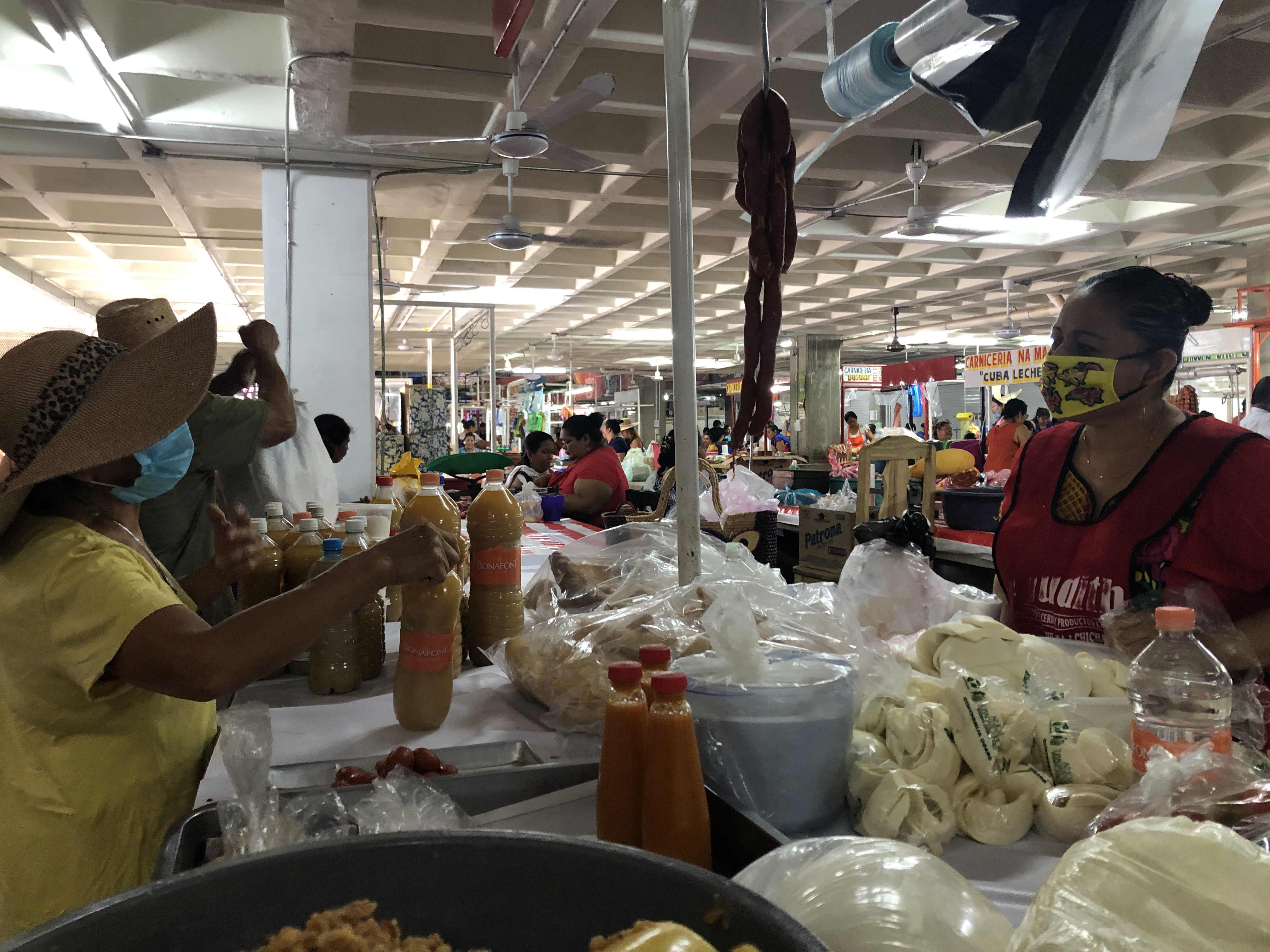 La vida en el mercado de Juchitán continúa, especialmente en el área de comida y verduras, las personas llegan a comprar y se van, no demoran, aquí todavía no se mide la sana distancia y muy pocas vendedoras usan cubrebocas.