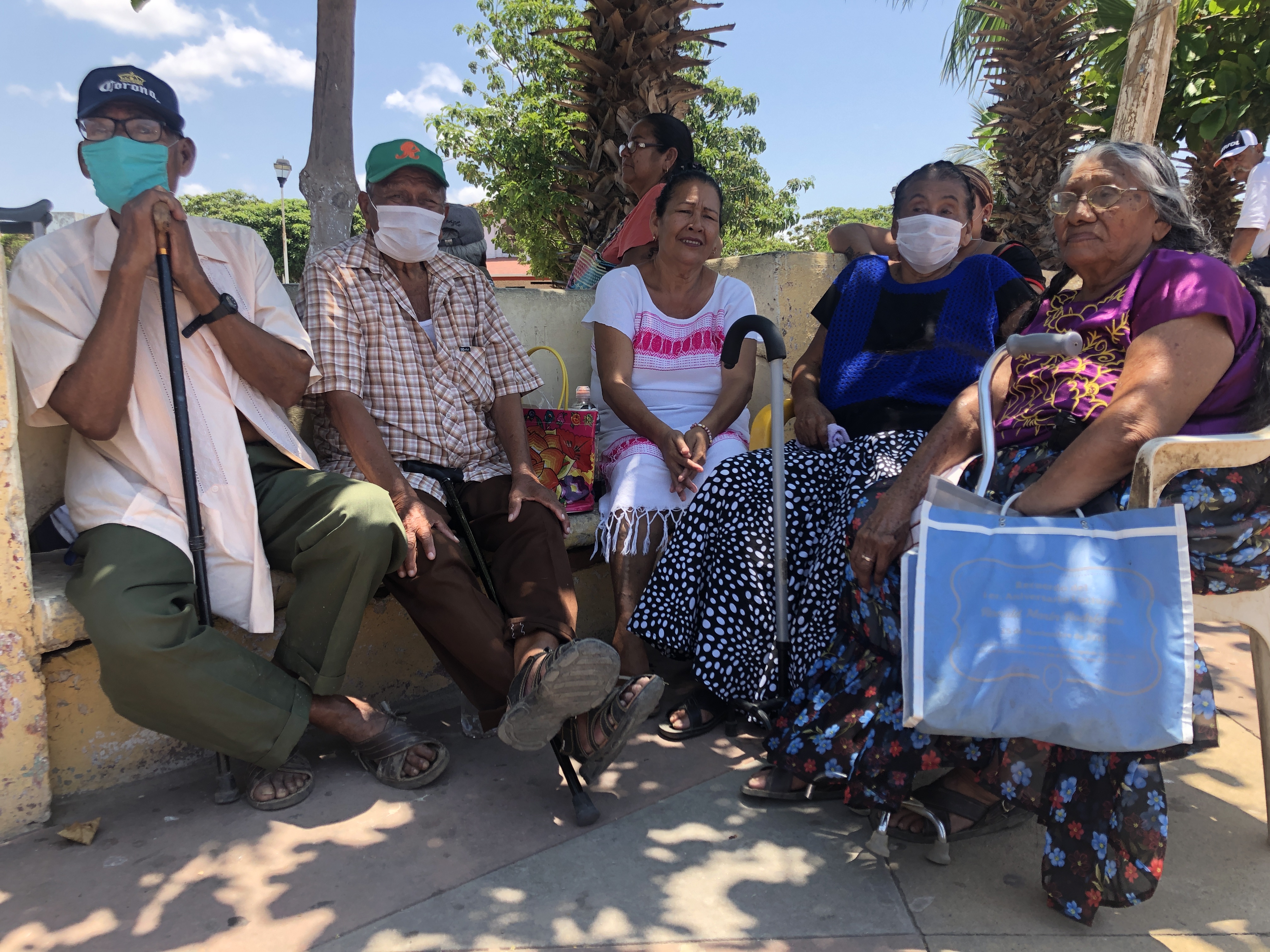Abuelas y abuelas sentados en el parque de la localidad de Unión Hidalgo, esperando cobrar su apoyo federal de “Adultos mayores”, no miden sana distancia, y traen los cubre bocas que les obsequiaron a propósito de la entrega del beneficio.