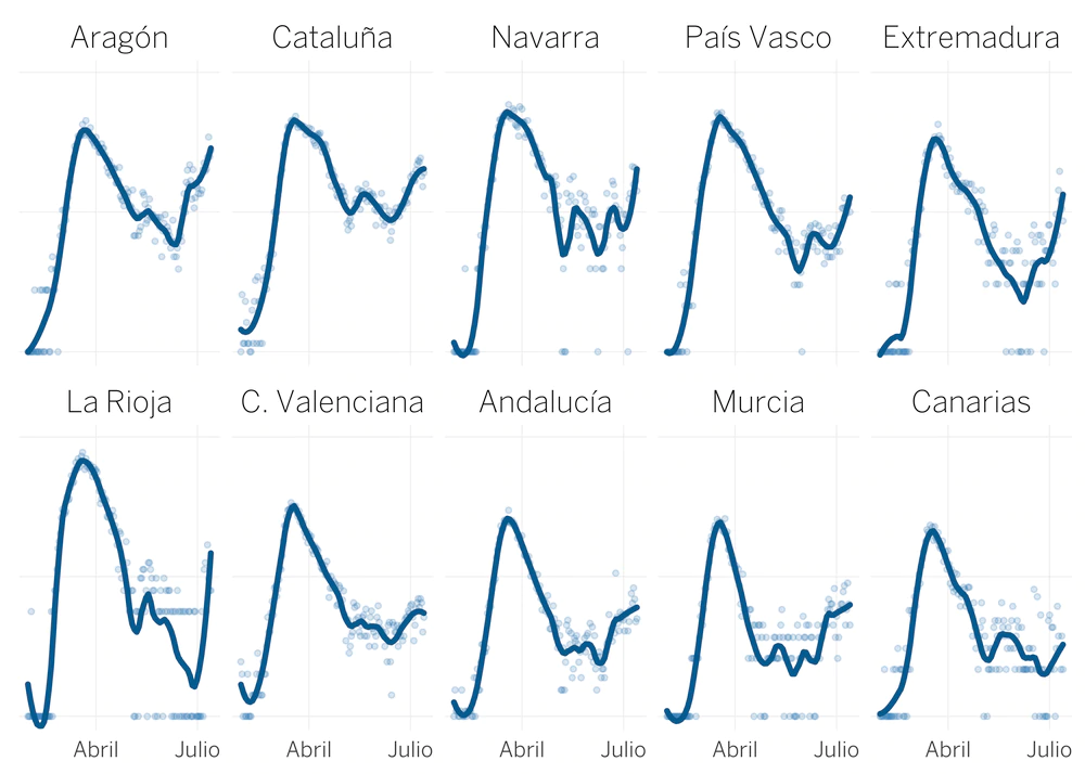 Después de meses en remisión, los positivos por coronavirus han vuelto a crecer a nivel nacional. A finales de mayo los casos diarios confirmados por PCR habían bajado de 500, y en junio llegaron a ser menos de 250, pero ahora se vuelven a superar los 1.000 positivos cada día.Los contagios parecen multiplicarse. Según el Instituto de Salud Carlos III, el número reproductivo ronda el 1,3 —calculado con la fecha del inicio de los síntomas—, y lleva dos semanas por encima de uno. Eso significa que los contagios crecen y podrían volverse exponenciales.El rebrote está llegando a algunos hospitales. Lo dicen médicos de varias comunidades y además se observa en las estadísticas oficiales: los ingresos llevan 10 días subiendo en España. En la última semana han sido hospitalizadas entre 30 y 40 personas cada día, cifras que no veíamos desde mayo —aunque siguen muy lejos de los 2.000 ingresados al día durante el colapso sanitario de abril. El repunte en los hospitales arrancó entre el 10 y el 12 de julio, una semana después de que repuntaran los positivos, como es habitual con la covid-19.Hay brotes en todas las comunidades y el repunte se aprecia en la estadística oficial. Es quizás la peor señal. No es solo que haya focos localizados en Huesca, Lleida o Cataluña, donde ya se habla de transmisión comunitaria, sino que los casos aumentan en casi todas partes: según las cifras del ministerio, el virus está creciendo al menos en 10 comunidades.No es casual que los rebrotes lleguen ahora. “Los achaco a que ha terminado la desescalada”, nos explica Ignacio Rosell, especialista en salud pública y miembro del Comité de Expertos de Castilla y León. “Con la nueva normalidad hay más riesgo. Cada vez más gente está confiada y se suman circunstancias estacionales, como temporeros, contactos de verano y reencuentros familiares”.Había dos incógnitas: nuestra actitud ahora y los preparativos de las administraciones. “Hemos visto que algunos se han relajado y también que la mayoría de las comunidades no han preparado bien sus programas de seguimiento de infectados y sus contactos. Estos factores combinados hace que estemos viendo un gran número de rebrotes y algunos muy preocupantes”, argumenta Helena Legido-Quigley, profesora asociada de la London School of Hygiene and Tropical Medicine.La experta tiene críticas para las comunidades: “La mayoría no han contratado ni preparado su sistema con el personal necesario. La idea de estar confinados también era darles tiempo, pero no han hecho los deberes, y esto va a tener consecuencias muy serias para la salud y la economía”. Y también para el Gobierno central: “No deberíamos haber pasado de fase sin tener estos sistemas listos. Se aseguró a todos los niveles gubernamentales que sí estábamos preparados cuando no lo estábamos”.El virus crece y tiene una incidencia alta (más de 10 casos por millón de habitantes) en Aragón, Navarra, Cataluña, País Vasco, Extremadura y La Rioja. Pero también crece en regiones con menos incidencia, como Murcia, Andalucía, Comunidad Valenciana y Canarias. Algunos repuntes son pequeños y podrían quedarse en un susto. Pero preocupa el patrón y la experiencia de marzo, porque demuestra lo rápido que puede crecer una bola de nieve de contagios.Los repuntes ya se notan en hospitales de algunas comunidades. El siguiente gráfico muestra los casos y las hospitalizaciones en cada región, que son crecientes en Aragón, Navarra, Cataluña, País Vasco, Extremadura, Comunidad Valenciana, Murcia y Andalucía. En otras comunidades el repunte es menos claro —como en La Rioja, Cantabria, Canarias, Baleares, Galicia o Asturias—, pero podría estar empezando. Madrid solo registra un ligero repunte, que podría quedarse en nada, pero que es inquietante por la situación en Barcelona o Zaragoza.Esta serie de datos es ligeramente distinta a la anterior. La primera mostraba los positivos por fecha de síntomas, que es útil porque nos asegura que el repunte que vemos se debe a contagios recientes (y no a que se hayan notificado casos antiguos). Pero esta segunda serie recoge los contagios por fecha de diagnóstico y tiene la ventaja de representar la tendencia hace apenas dos días.La mejor noticia es que los fallecimientos no han aumentado. De hacerlo, lo harían con dos o tres semanas de retraso sobre los contagios, por el proceso normal de la enfermedad. Pero además es posible que el virus resulte (o al menos parezca) menos letal en esta oleada, porque se están detectando más contagios de gente joven. La mediana de edad de los nuevos casos está en 48 años, frente a los 60 de abril. Esto se debe en parte a un sesgo de detección por gravedad, ya que entonces solo conocíamos los casos más severos, que a menudo eran gente mayor. Pero también puede ocurrir que ahora se contagien menos ancianos, porque tienen menos contactos en general, y menos personas vulnerables en general, que quizás hayan extremado sus precauciones.Es importante no comparar las cifras absolutas con las de marzo o abril, porque la detección hoy es mejor y se estará registrando un porcentaje más alto de los casos reales. “En marzo por cada positivo PCR podía haber 10 (o más) no diagnosticados. Ahora seguro que son muchos menos”, explica Rosell. “Pero si se descontrola, si entra en las residencias de mayores, si se extiende en personas vulnerables, por supuesto aumentarán los casos graves”.En Cataluña y Aragón el virus se expande por todas partes. No es solo Barcelona y Lleida donde hay transmisión comunitaria. Los casos crecen en todas las provincias de las dos comunidades. En Tarragona, la provincia catalana menos afectada por el virus hasta ahora, los nuevos positivos superaron los 10 por millón por primera vez desde mayo. En Zaragoza van camino de superar los 100 por millón y los casos crecen casi al ritmo de marzo.El grupo de investigación en Biología Computacional y Sist