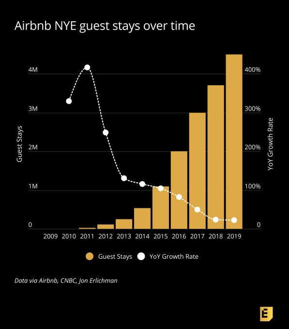 Aquí está el recuento de las estancias de los huéspedes en Airbnb durante la víspera de Año Nuevo (datos a través de CNBC, Jon Erlichman, Airbnb), y sus tasas de crecimiento resultantes año tras año: