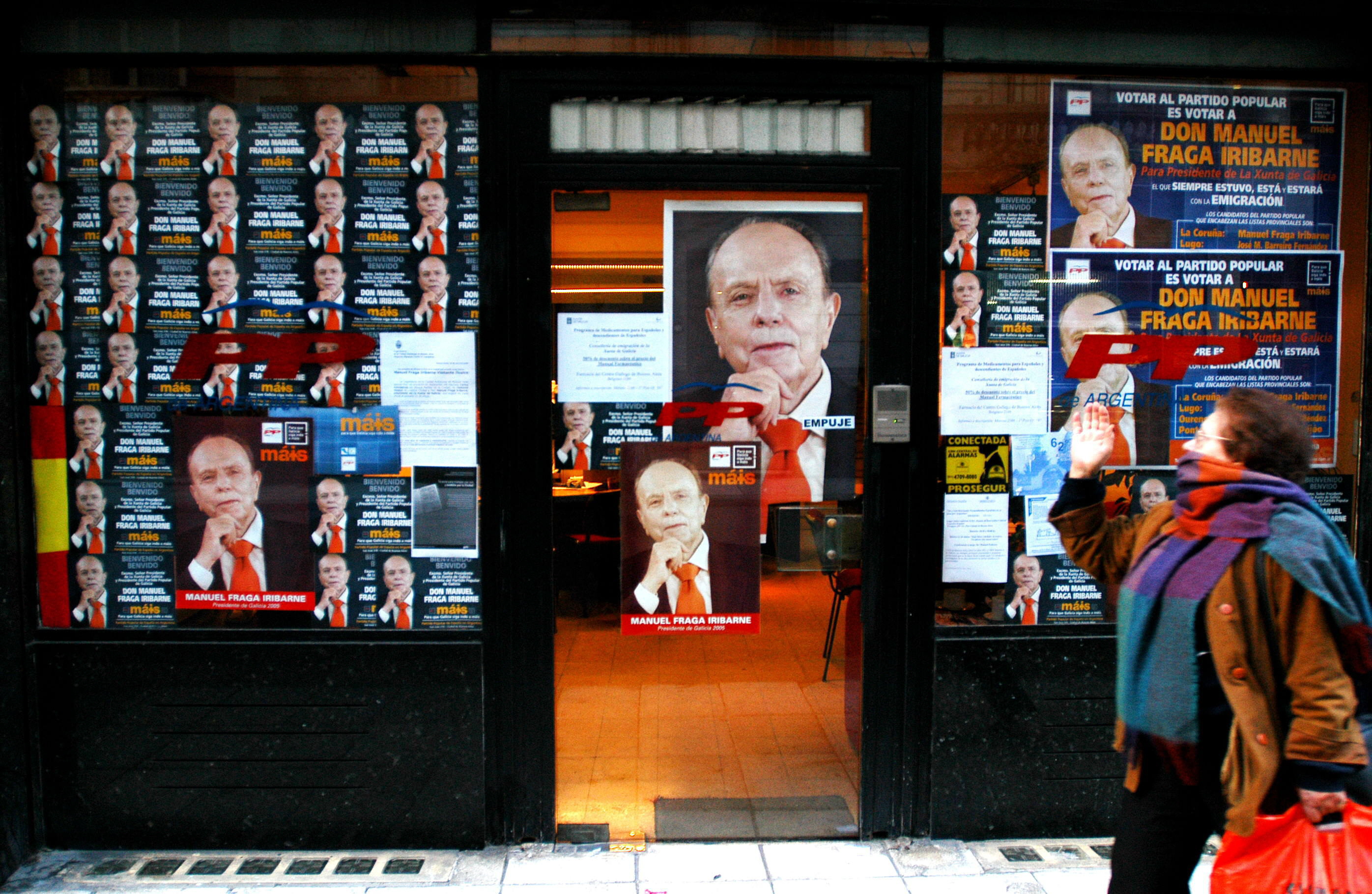 Los carteles de la propaganda política del PP en Buenos Aires, encabezado por Manuel Fraga, siguen pegados en la sede del partido tras las elecciones gallegas celebradas en 2005.Cézaro De Luca (EFE)