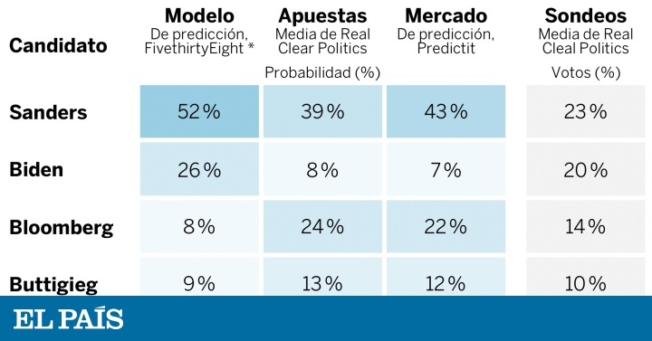 Izquierdistas contra moderados. La carrera demócrata tiene dos carriles: por el carril moderado compiten Biden, Bloomberg, Amy Klobuchar y Buttigieg (aunque este último juega también la carta de outsider), mientras que Elizabeth Warren y Sanders compiten por el carril de la izquierda.Los datos. La tabla siguiente muestra la probabilidad que tiene cada candidato de acabar ganando las primarias, según un modelo estadístico, las apuestas y un mercado de predicción: