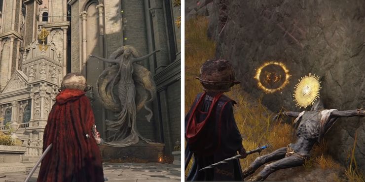 El hermano Corhyn estará agachado en la base de la lanza en espiral gigante cerca de las ruinas de la ciudad, y una vez que los jugadores hayan agotado su diálogo, podrán recargar el área para adquirir su atuendo. Algunos Tarnished también han mencionado que también puede aparecer en el mismo puente cerca de las Ruinas Stargazer con el mismo diálogo. Asimismo, recargar el área otorgará a los jugadores sus pertenencias. En cuanto a Goldmask, los aventureros pueden encontrar el cadáver del mentor al suroeste del Sitio de Gracia de Ashen Capital. Su cuerpo estará tendido contra la pared del acantilado con la Runa reparadora del orden perfecto flotando sobre él. Los jugadores pueden recargar el área para obtener su conjunto de armadura. Sin embargo, su Máscara Dorada Radiante está en un lugar separado en Anillo de Elden. Tarnished debe viajar a la Meseta de Altus para encontrar la máscara sobre el puente derrumbado al sur de Road of Iniquity Side Path Site of Grace.