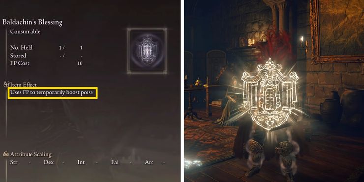 Al consumirse, Baldachin’s Blessing tarda varios minutos en disipar la Desventaja de HP del jugador, sin embargo, durante este tiempo, los jugadores recibirán un beneficio que aumenta temporalmente el Equilibrio. Para aquellos que no están tan familiarizados con el almas franquicia, el equilibrio es una estadística base crucial en Anillo de Elden eso determina el grado en que el Deslustrado puede resistir ser estremecido por los ataques enemigos. En otras palabras, tener un alto nivel de equilibrio permite a los jugadores ser más resistentes a ser aturdidos o a que sus ataques sean interrumpidos.