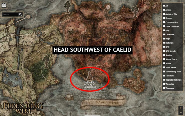 La Catedral de la Comunión del Dragón es una catedral en ruinas en Anillo de Elden situado en la zona suroeste de la comarca de Caelid. La forma más rápida de llegar a este lugar es viajar a Caelid Highway South Site of Grace y seguir la carretera principal hacia el este en Anillo de Elden hasta llegar a una bifurcación del camino. Dirígete hacia el sur desde la bifurcación y la Catedral debería estar a la vista.
