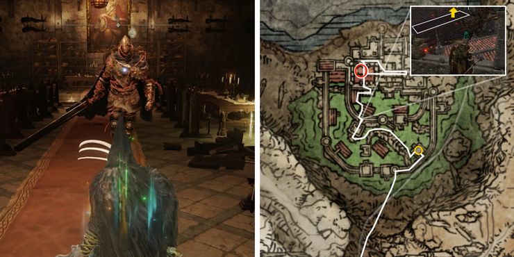 Un pantano tóxico rodea Shaded Castle y está invadido por babosas, humanoides zombificados y monjes corruptos. Para llegar desde la sala exterior al interior del castillo, ingrese a las paredes desde Shaded Castle Ramparts Grace Site en el este. En la parte occidental del fuerte se puede encontrar una escalera alta que conduce a la parte superior de las almenas interiores. Desde aquí, salta sobre los tres tejados para llegar al sitio Shaded Castle Inner Gate Grace. Luego, sube la escalera y atraviesa la subcapa debajo de Castellan’s Hall. El primer edificio tendrá varios guardias escondidos detrás de las esquinas esperando para emboscar al jugador, así que camina con cuidado. Finalmente, el camino lineal conducirá a un ascensor al paso elevado de madera conectado a la cámara del jefe de Elemer.