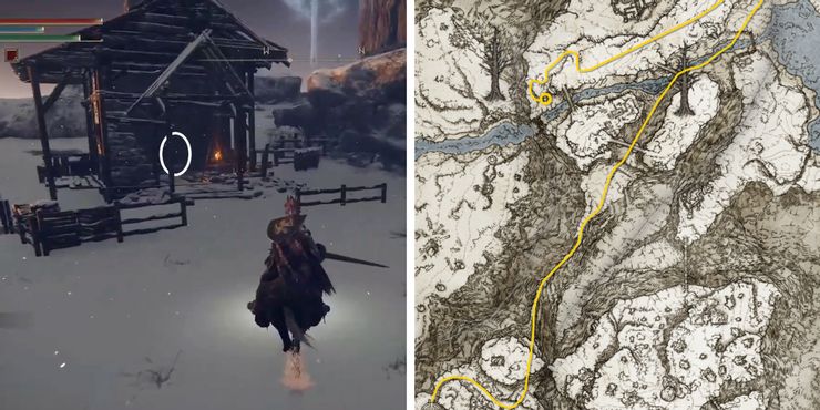 A continuación, suba la pendiente corta y viaje hacia el oeste hasta el mirador de las ruinas de Snow Valley. En el camino, varios arqueros dispararán contra el jugador, pero se pueden evitar fácilmente sobre Torrent. Sin embargo, un Tibia Mariner cercano no se pasa por alto tan fácilmente, generando esqueletos gigantes del suelo para atacar al jugador. Tenga cuidado con sus ataques de rayos a distancia. Además, un pájaro del rito de la muerte aparecerá a lo largo de este sendero durante la noche. En lugar de ir a la izquierda a Stargazer Ruins, Tarnished puede descender por los pequeños acantilados en el oeste para encontrar Shack of the Lofty. Busca en la cabina para obtener el set de doncella viajera en Anillo de Elden.